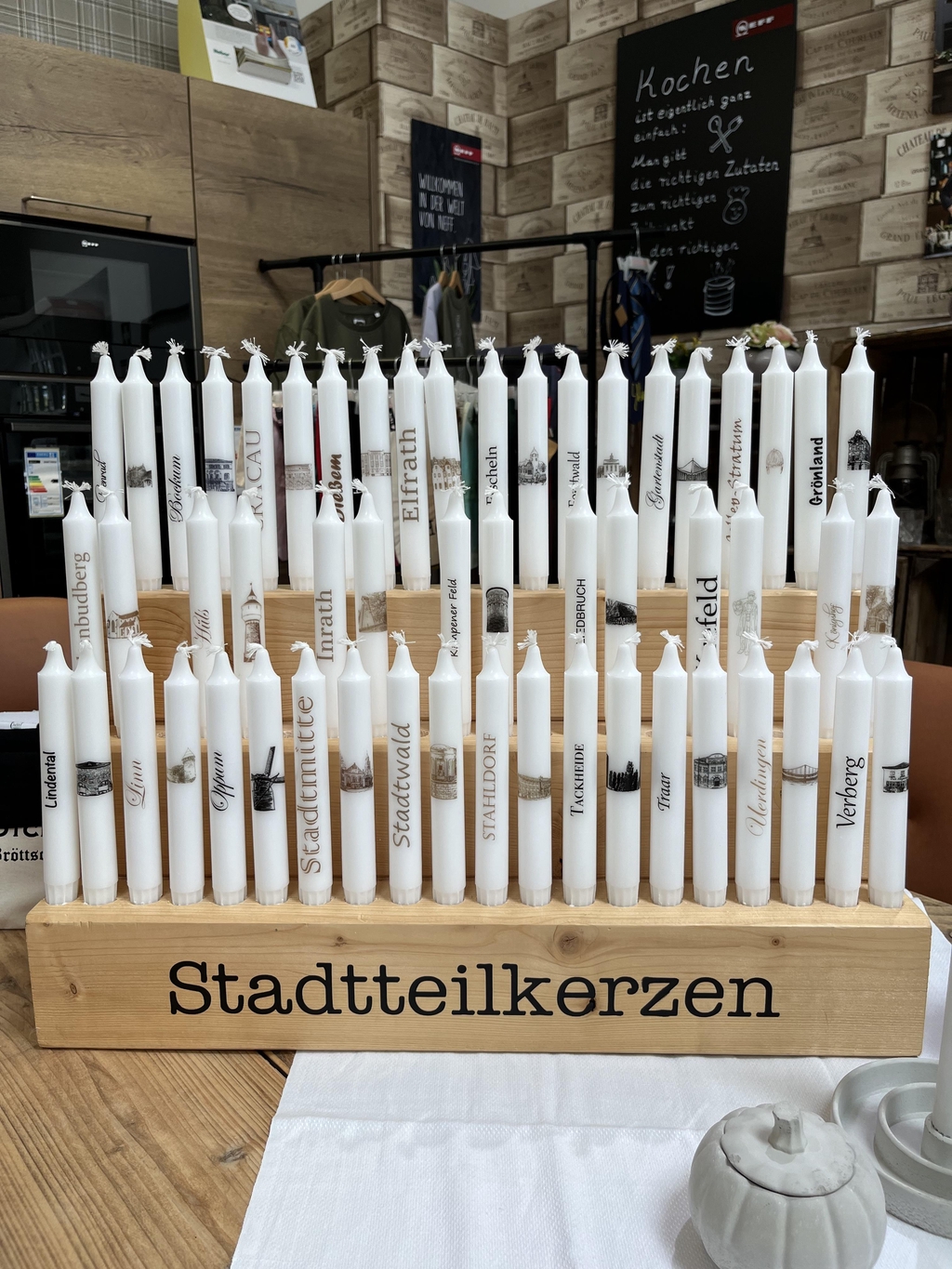 Besonders stolz sind wir auf unsere Stadtteilkerzen, die typische Gebäude mit den passenden Stadtteilnamen vereinen – egal ob Oppum, Hüls oder Fischeln.